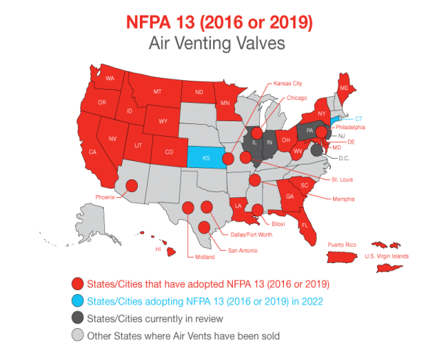 Jurisdictions across the country are adopting NFPA 13 (2016) by itself or by reference through IBC 2018 adoptions. The following chart is a reference of which states have adopted or will be adopting the code to require air vents. *Please consult your AHJ to confirm local code requirements.